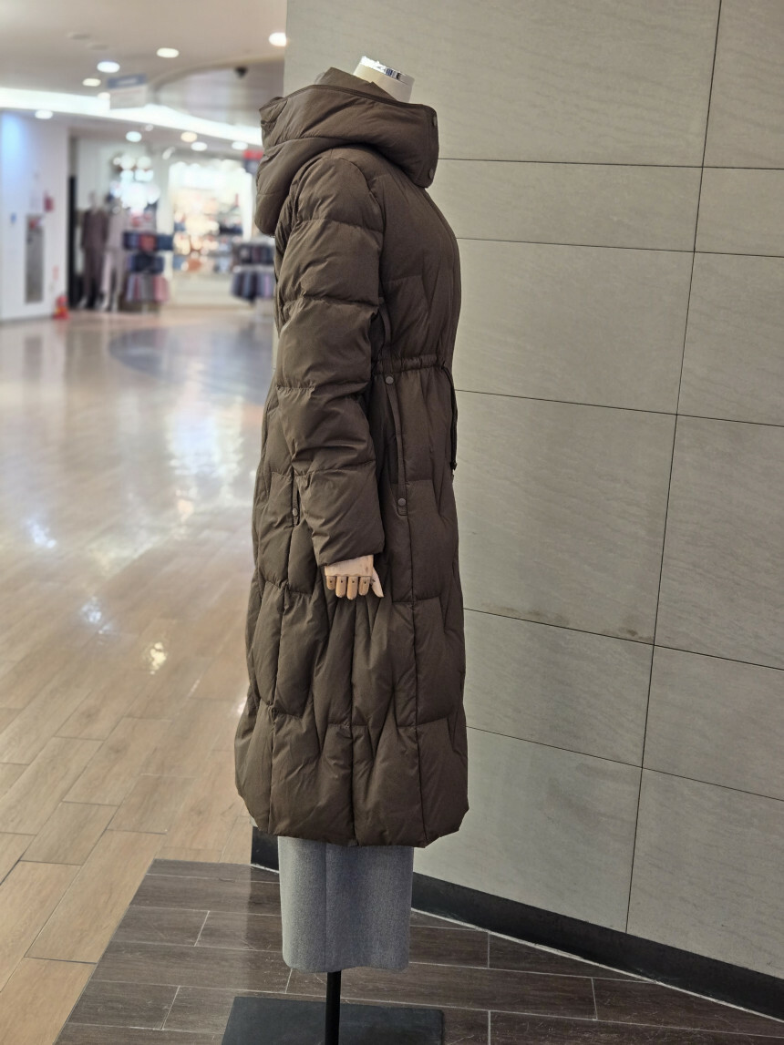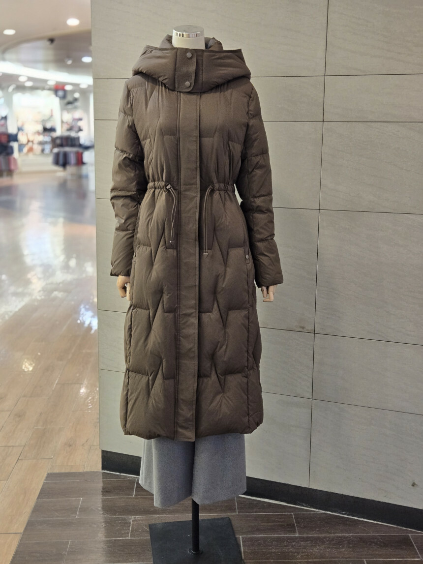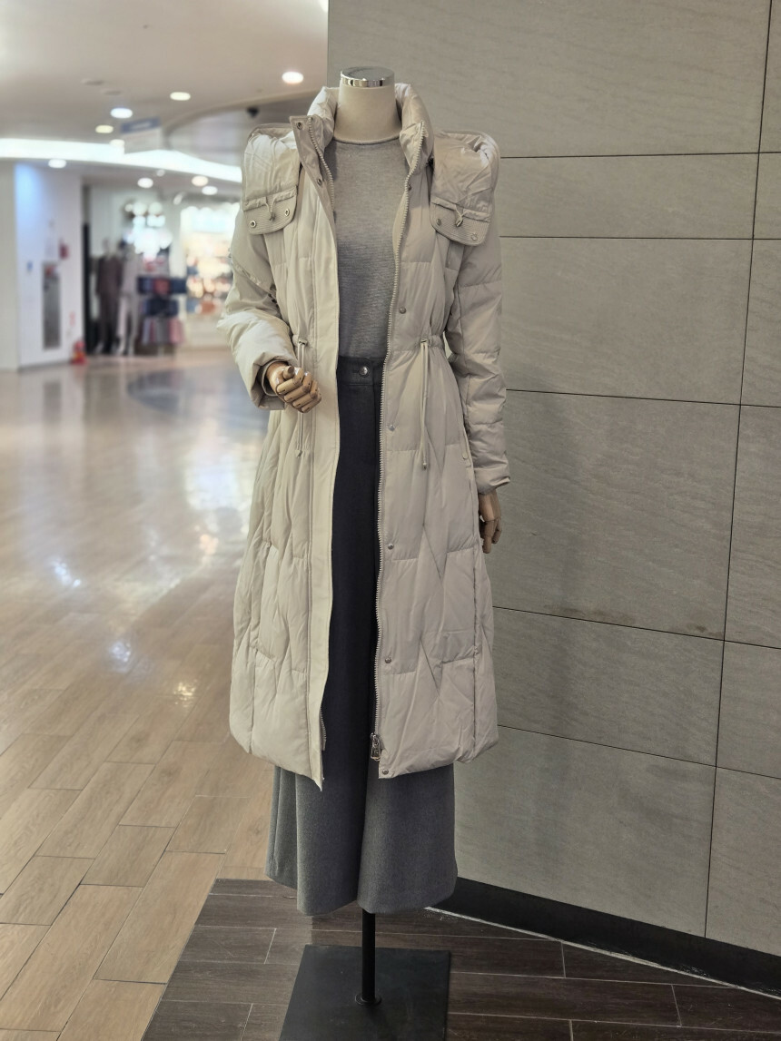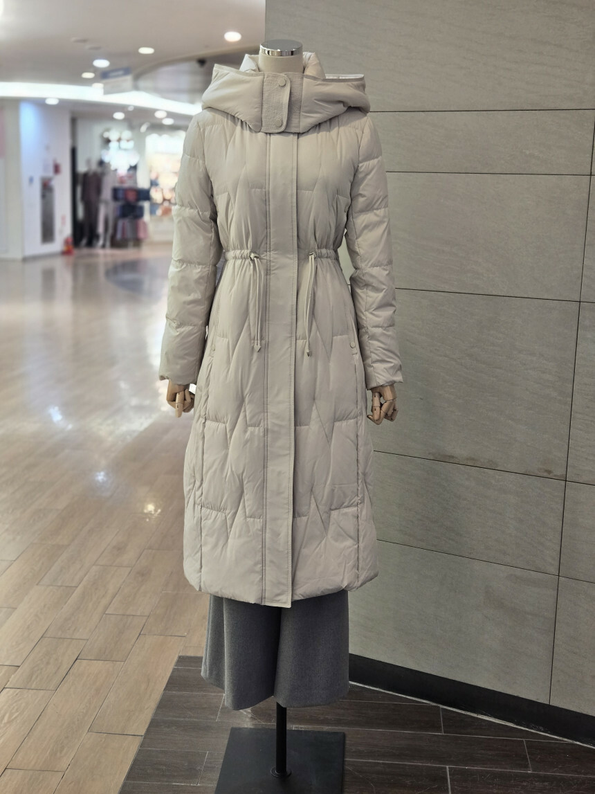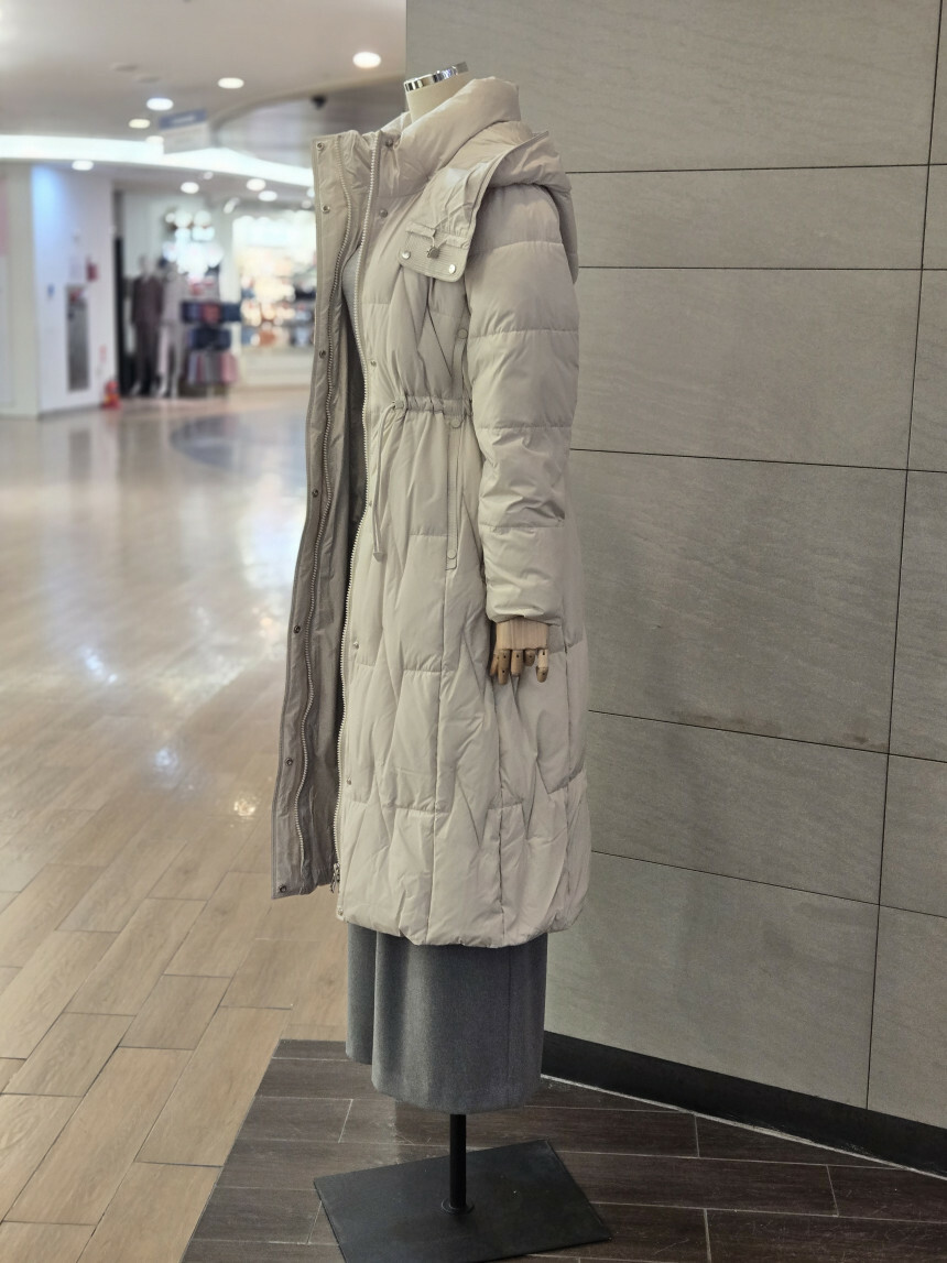 포근한 착용감에 롱기장 허리선 심플하게 스트링연출되는 가볍운 롱패딩
