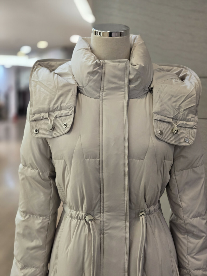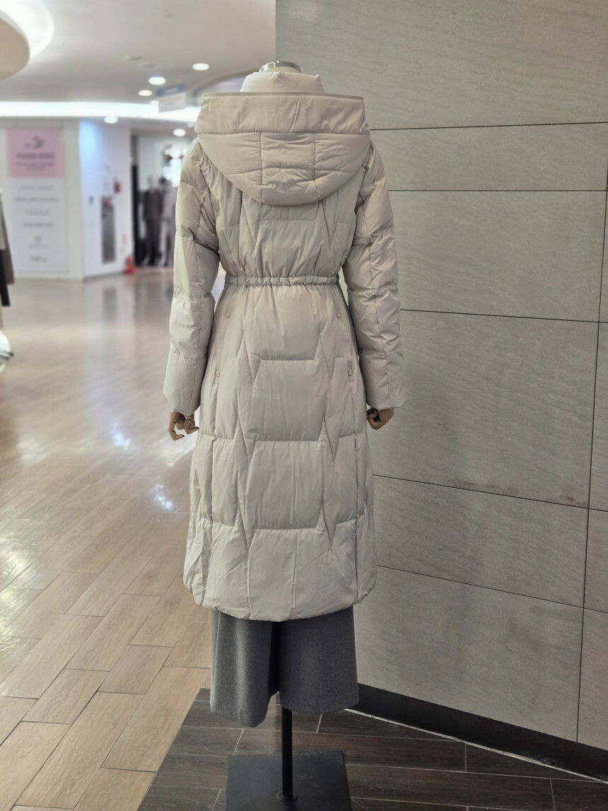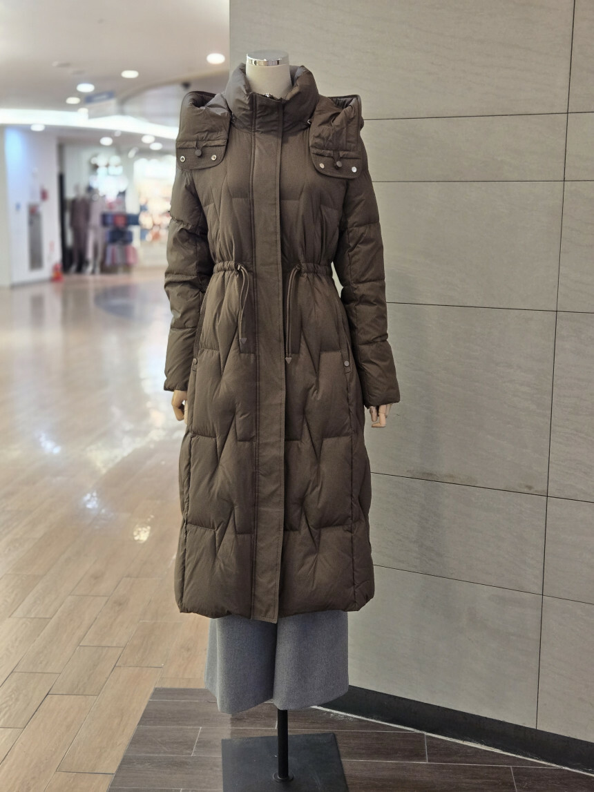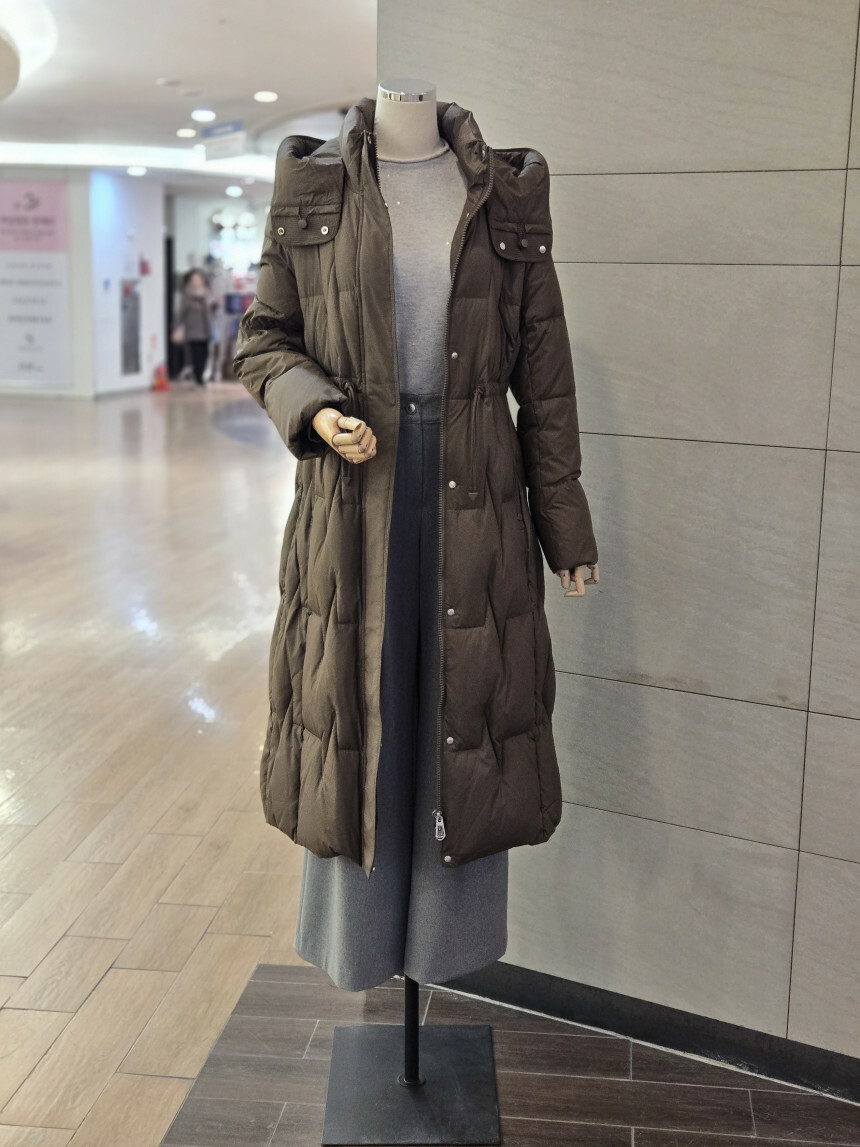 포근한 착용감에 롱기장 허리선 심플하게 스트링연출되는 가볍운 롱패딩