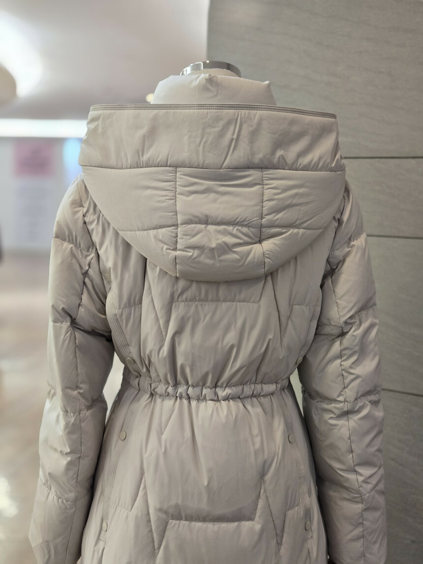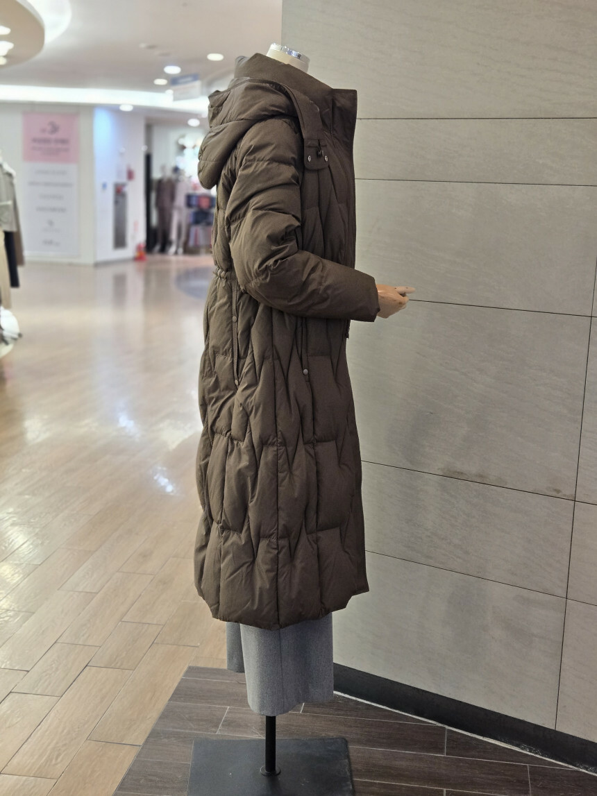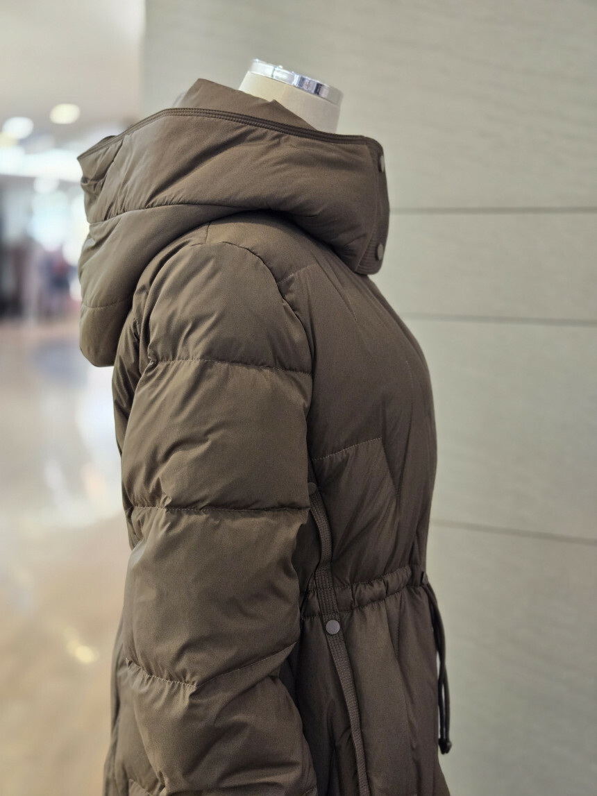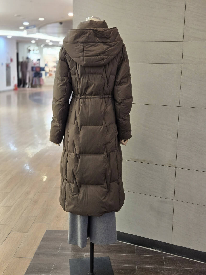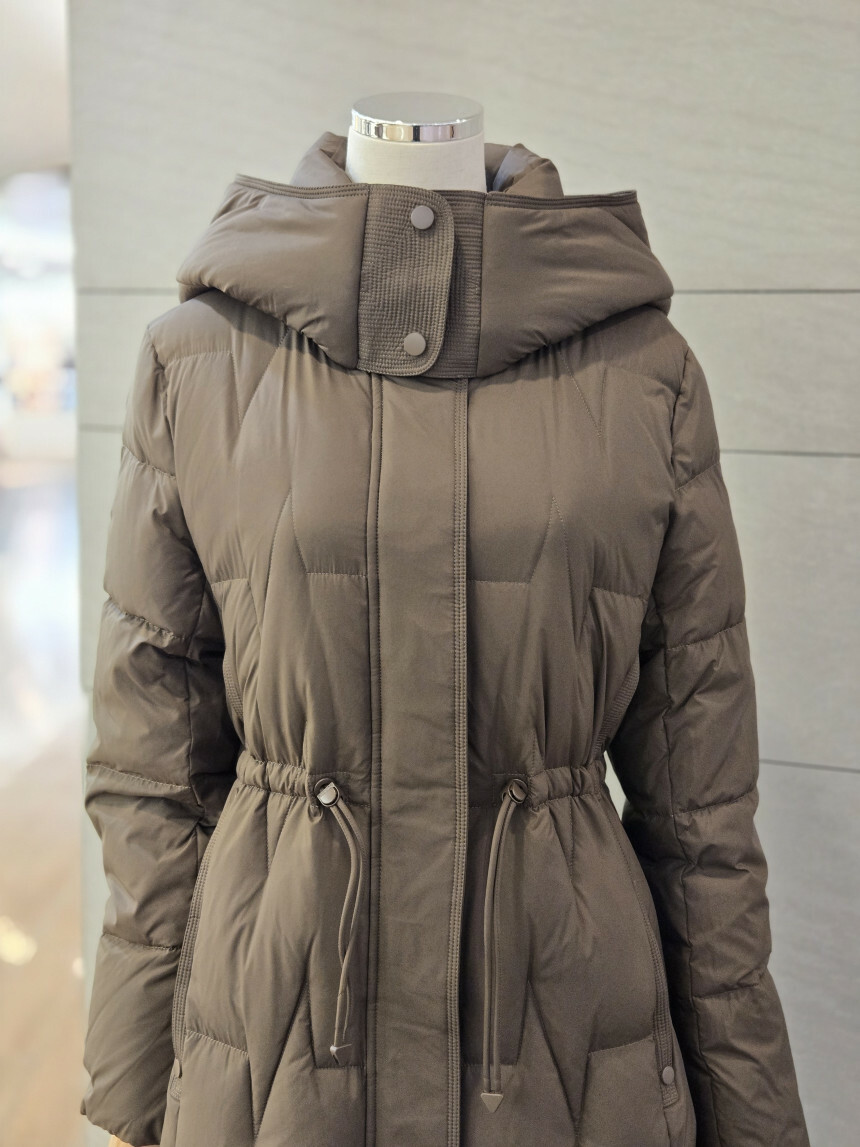 포근한 착용감에 롱기장 허리선 심플하게 스트링연출되는 가볍운 롱패딩