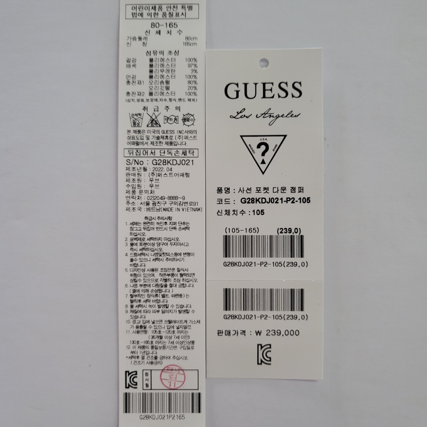 * 혼용율: 겉감 : 폴리에스터 100% 배색 : 폴리에스터 97% 폴리우레탄 3% 안감 : 폴리에스터 100% 충전재1 : 오리솜털 80% 오리깃털 20% 충전재2 : 촐리에스터 100%