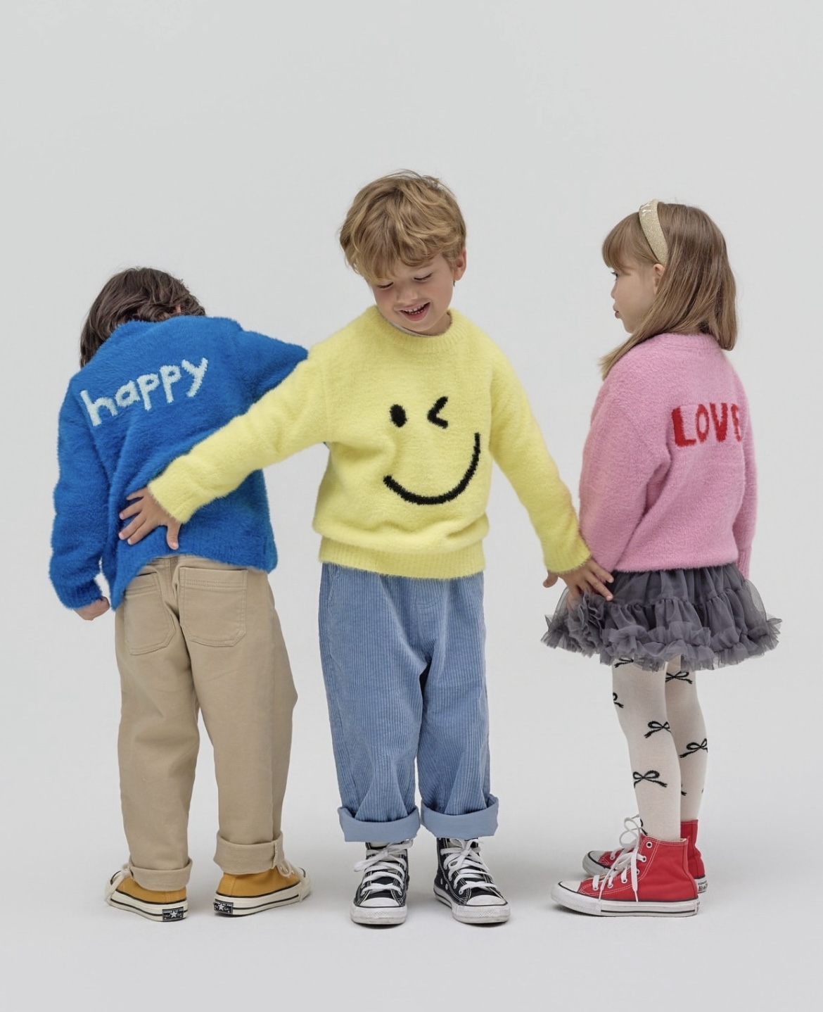 눈에 띄는 컬러 배색과 위트 있는 스마일 자카드 패턴이 귀여운 무드를 더해주며,