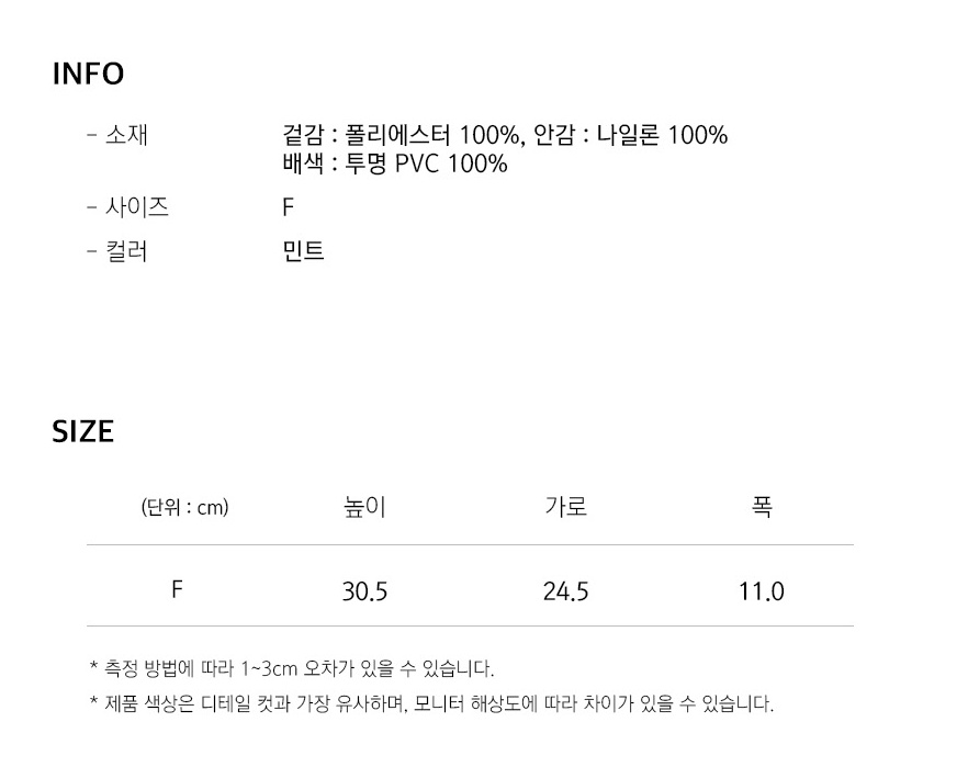 재질 : 겉감-폴리에스터100% 안감-나일론100% 배색-투명PVC100%