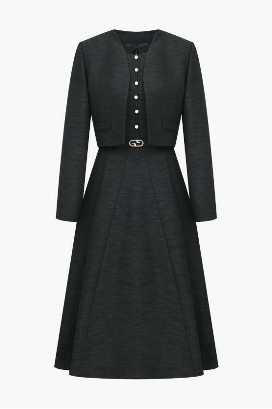 우아한 실루엣을 완성하는 자켓과 원피스가 레이어드된 아이템입니다.