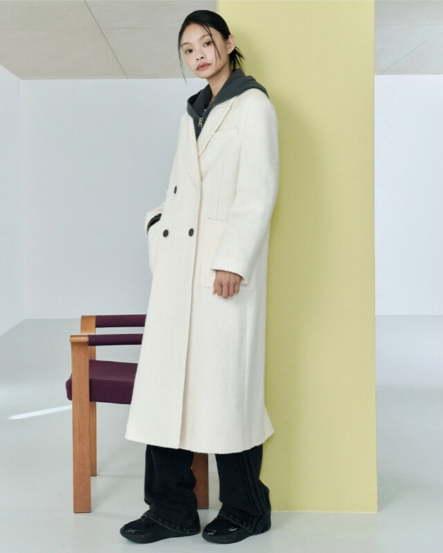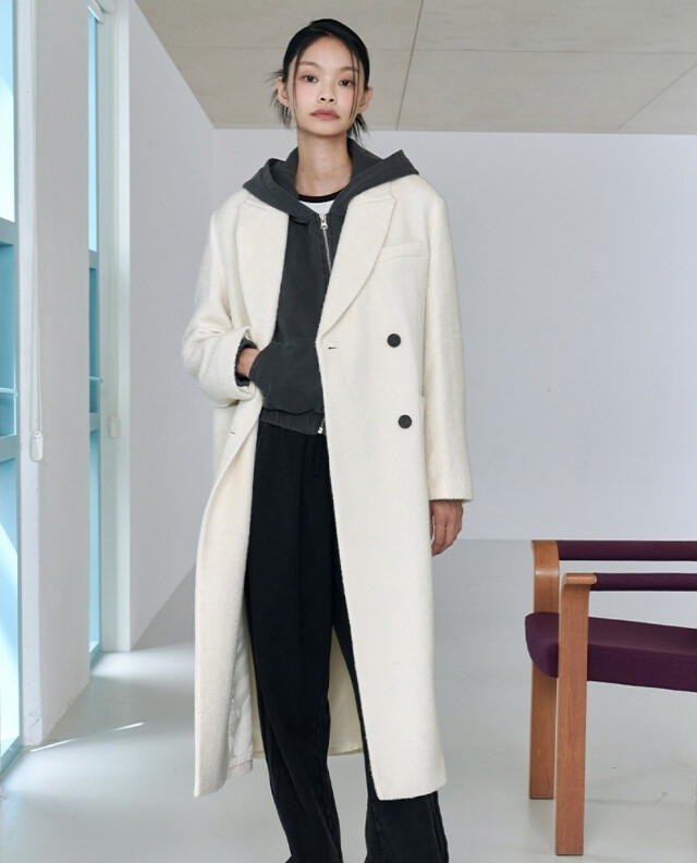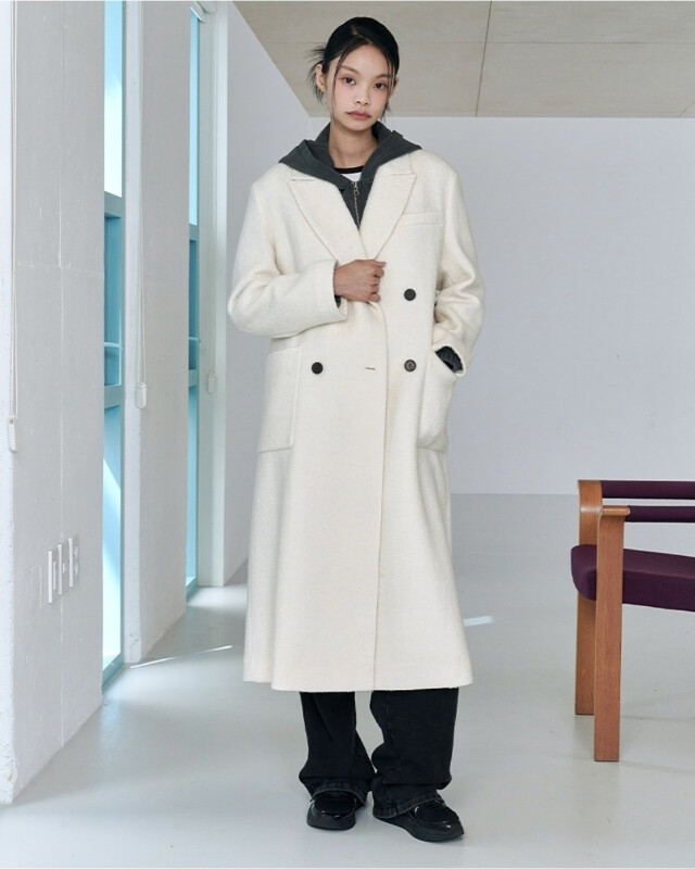 포근한 외관의 울 혼방 소재로 제작한 더블 롱 코트입니다. 여유있는 실루엣과 더블 브레스티드 디자인으로 세련된 무드를 강조하였으며 긴 기장감으로 멋스러운 연출이 가능한 스타일입니다. 뒷판 밑단에 슬릿 디테일로 한층 편안한 착용이 가능합니다.