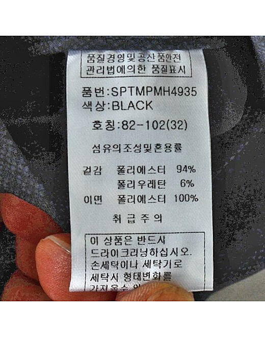 | 1. 제품 소재 (섬유의 조성 또는 혼용률을 백분율로 표시, 기능성인 경우 성적서 또는 허가서) | 폴리에스터94%폴리우레탄6% |