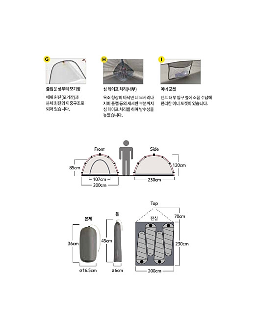 1. 제품소재 본체:10데니어 고강력 폴리에스터 [발수가공] 플로어:30데니어 바리스틱 나일론 립스톱 [내수압1,500mm 우레탄 코팅] 폴 :알루미늄합금(폴 지름9.6mm)