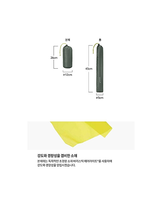 1. 제품소재 | 본체:10데니어 바리스틱에어라이트나일론립스톱[내수압 1,000mm 우레탄 코팅,발수가공] 플로어:30데니어 나일론 립스톱 [내수압1,500mm 우레탄 코팅] 폴 :알루미늄합금(폴 지름8.5mm) |