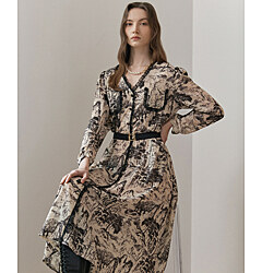 수묵화 드로잉 패턴 브이넥 롱 원피스(벨트2종포함)