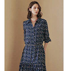 알파벳 패턴 벨티드 셔링 셔츠 롱 원피스