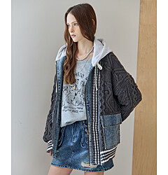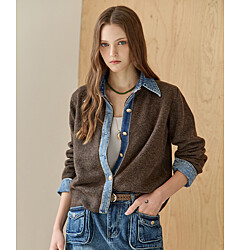 워싱 데님 셔츠 카라 블록 니트 가디건
